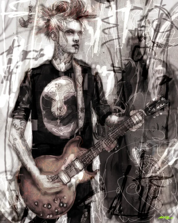Deep blacks and subtle grays intertwine in this high-resolution digital artwork. The composition highlights a figure holding a guitar, adorned with distinctive tattoos that add complexity. A minor ink bleed at the corner gives it an authentic feel. Abstract scribbles in the background evoke motion and rebellion, while detailed digital effects enhance energy. This is a print-ready digital file for canvas, fine art paper, or metal. Inspired by the rush of live music, I wanted to capture a feeling of raw energy and expression. The interplay of monochrome tones feels nostalgic yet fresh. Print this 38 x 48.3 cm digital artwork on metal for an edgy statement piece in your music studio. Perfect for anyone looking to make a bold impression. Let me know when you’re ready!