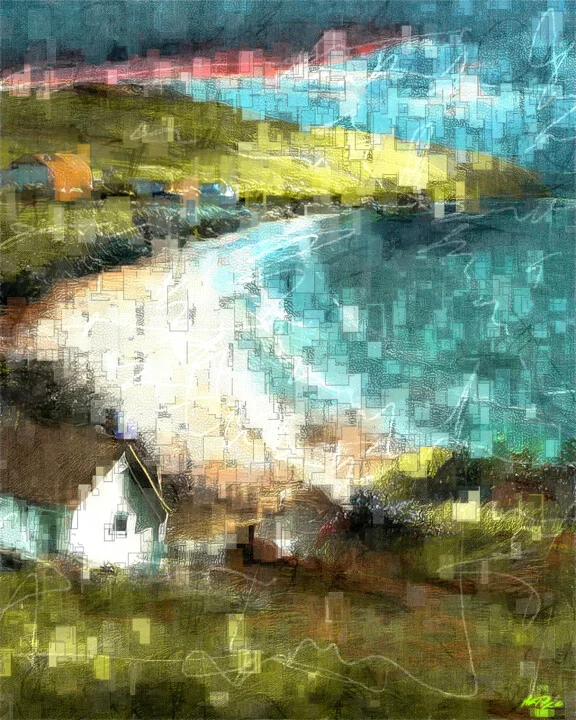 Bright greens and blues merge in this energetic 38 x 48.3 cm digital artwork featuring a charming cliffside house. The pixelated texture mimics sunlight dancing on water, while a soft cerulean gradient flows into warm yellows. A slight unevenness in the gradient adds a whimsical touch. The layers create a captivating depth that draws the viewer in, making this a print-ready piece that pops in any setting. Inspired by peaceful coastal landscapes, I aimed to convey tranquility and joy through this work. Hang this 38 x 48.3 cm artwork on an acrylic surface for a stunning hallway display. For anyone who loves vibrant, calming art, this piece is ready to uplift your space.