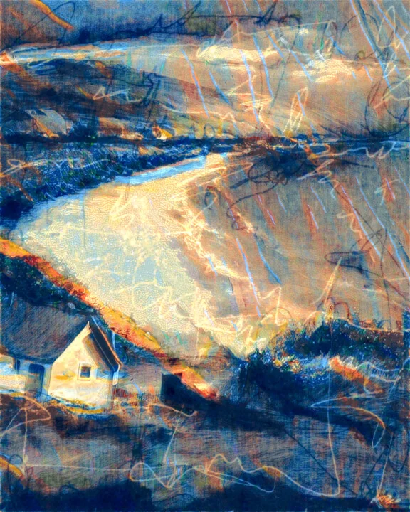 This vivid digital artwork captures a quaint house by the cliff in a harmony of oranges and soft blues, measuring 38 x 48 cm. I layered colors to create dynamic depth, especially where sunlight sparkles on the water. There's a brushed-over script detail that weaves through the landscape, showcasing a playful contrast. The light reflects beautifully off the artwork, enhancing its vividness. A print-ready digital file that shines in any medium. Inspired by breathtaking cliffside views, this piece evokes both peace and wonder. Perfect for your living room, this 38 x 48 cm digital art creates a captivating focal point. If you're looking for a unique addition to your collection, this original piece is waiting for you.