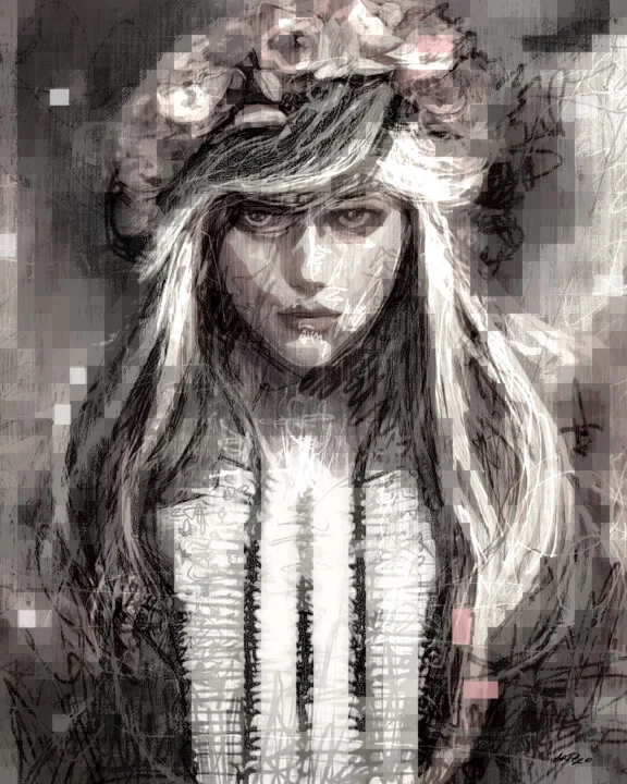 This digital artwork captures an Indian girl in grayscale, accented with warm tones. The layered composition blends pixelated effects, creating a balance of realism and abstraction. I carefully painted her floral crown, which draws the eye toward her expressive gaze. A unique detail is the texture created through digital brush techniques. There's a slight blur where I adjusted the colors, giving it character. Light beautifully enhances the textures, making it visually captivating. A print-ready digital file for various printing options. Inspired by cultural fashion, I aimed to create a piece that feels both traditional and modern. This work evokes strength and spirit. Print this 76.2 x 58.4 cm art on fine art paper for a stunning addition to your bedroom wall. It’s for those who appreciate a blend of heritage and contemporary style. Bring this piece to life in your space!