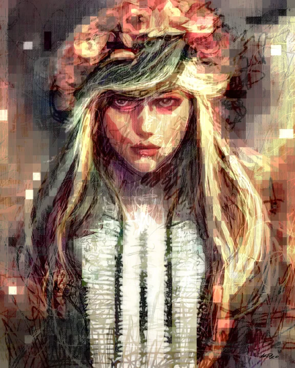 This captivating digital artwork features an Indian girl adorned with a floral crown, merging warm ochre and soft rose tones. Intricate pixel-like effects create a mesmerizing texture, especially in her hair and floral details. A unique feature is the layering of textures that adds depth and vibrancy. There’s a small smudge on the side where I adjusted the design, giving it a personal feel. The light dances across the colors, enhancing the overall aesthetic. Perfect as a high-resolution digital file for various prints. Inspired by traditional Indian celebrations, I aimed to capture the beauty and depth of culture. The warm colors evoke nostalgia and comfort. Print this 76 x 58 cm digital artwork on fine art paper for a stunning addition above your bedroom dresser. Ideal for those who love rich cultural expressions in art. Enjoy making this piece a part of your space!