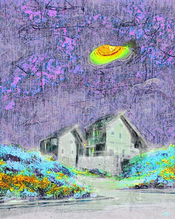 This 76.2 x 93.98 cm digital piece plays with electric greens and soft blues, featuring a stylized house against an abstract backdrop. The colors blend seamlessly, with hints of orange sparking against the blues. I crafted the texturing with layer compositing, revealing a slight bump on the surface where the paint was too thick. Light interacts uniquely with the colors, creating depth and intrigue. Hand-painted original, it's a visual delight. Inspired by the striking vistas of the Irish coast, this artwork evokes warmth and nostalgia. This 76.2 x 93.98 cm piece would shine as a centerpiece in your living area. Perfect for individuals who appreciate surreal beauty and conversation starters. Can't wait for you to see it!