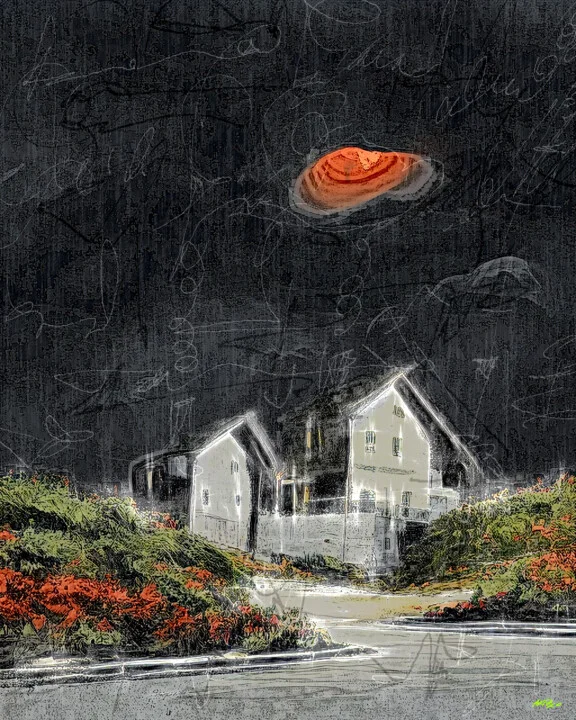 This digital artwork, measuring 76.2 x 94 cm, features a quaint house bathed in the glow of an orange moon against a textured night sky. The layered effects create depth, with lush greenery in the foreground. I crafted the piece carefully, and there's a minor texture lift in one corner giving it charm. Light from the moon highlights the house, inviting warmth despite the night. Hand-painted original, it offers a delightful visual experience. Inspired by coastal landscapes, this piece captures the mystery of night. It evokes calm and wonder, ideal for contemplative spaces. This 76.2 x 94 cm digital artwork would be an eye-catching centerpiece in your living room. It's for those who appreciate the beauty of night. Excited for you to enjoy this piece!