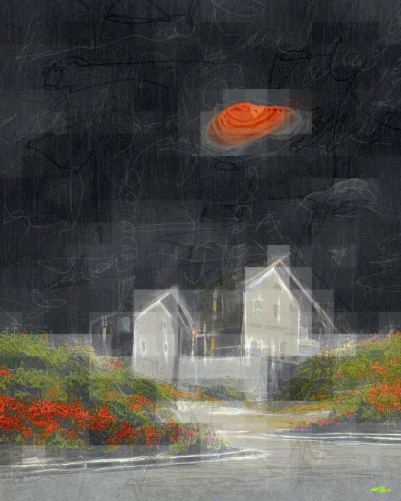 This 76.2 x 93.98 cm digital painting captures a quaint seaside house illuminated by a glowing orange moon. I blended muted grays with striking reds, creating a bold contrast against the dark backdrop. There's a slight blur around the moon where my brush slipped, adding a unique softness. The transparency layers bring depth to the house's silhouette, while the light reflects off the smooth surface, enhancing the warmth of the scene. It's a hand-crafted digital piece that feels inviting. I envisioned this artwork on a tranquil evening, remembering the peacefulness of seaside nights. This 76.2 x 93.98 cm piece would add a sense of calm to the wall above your living room sofa. Perfect for anyone who loves coastal vibes with a touch of nostalgia. I hope it finds a special place in your home.