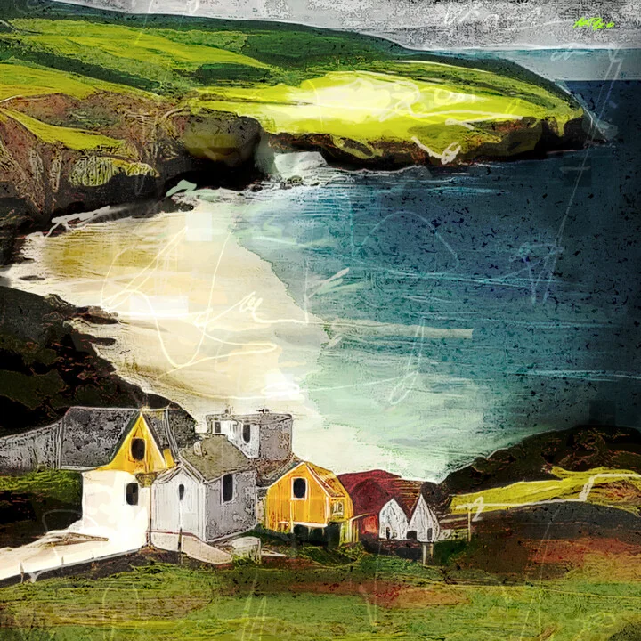 This 61 x 61 cm digital artwork features vivid yellow and white houses set against rolling green hills and a striking blue sea. Inspired by a serene coastal village, I used bold brush strokes to create a vibrant atmosphere. There's a minor lift in the edge where I layered colors too thickly, adding a handmade charm. The interplay of colors catches the light beautifully, highlighting the textured background. This digital piece is ready for high-quality prints. Capturing the magic of coastal tranquility, this 61 x 61 cm artwork invites calm into your space. It would look lovely above your dining room table, creating a bright focal point. Perfect for anyone who cherishes the beauty of nature. I look forward to sharing this piece with you.