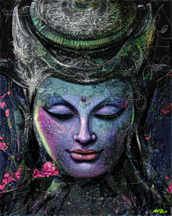 This artwork envelops a goddess figure in violet and azure hues, rendered in a 38 x 45.7 cm digital format. I used a layering technique that created depth, but there’s a small imperfection where the colors blended unexpectedly. The soft floral patterns dance around her face, while the vibrant pinks contrast wonderfully with the dark backdrop, creating a striking visual balance. Inspired by a moment of meditation, I wanted to blend colors from my surroundings. This artwork would make a bold statement above your meditation corner. It’s for anyone looking to add a pop of serenity to their space. I’d love for you to consider this piece.