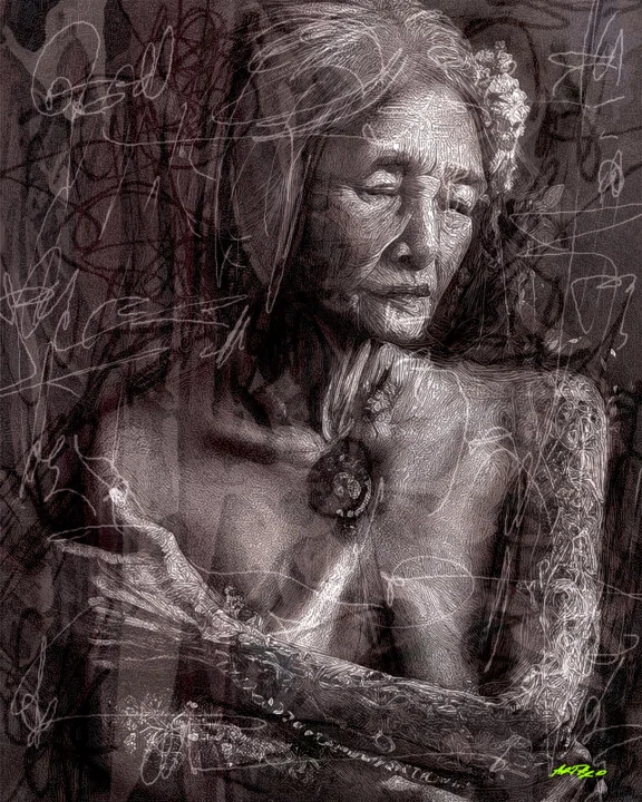 This high-resolution digital piece captures the solemn expression of an elder woman in striking black and white, sized at 38 x 46 cm. I used detailed digital brushwork, and there’s a faint scratch in the upper corner. The intricate layering reveals textured details, adding depth while the background's chaotic scribbles contrast beautifully with her serene presence. Inspired by the wisdom of elders, I aimed to reflect both strength and vulnerability in this artwork. It evokes calm and reflection, making it ideal for your living room. It’s for those who appreciate the stories told through art. I’m looking forward to seeing this in your home.