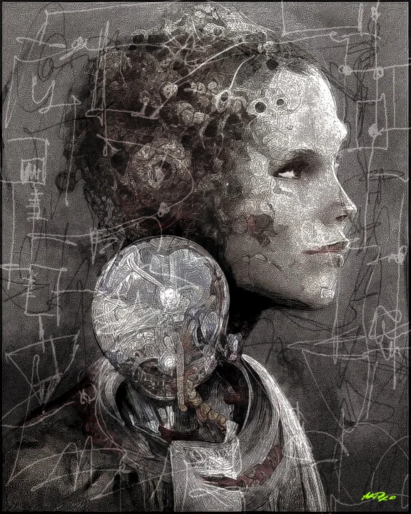 This 38 x 48.3 cm digital artwork blends browns and grays into a striking portrait of a woman intertwined with mechanical elements. I used a fine brush to merge human features with robotic textures, and there's a noticeable layer where my pen slipped—a charming flaw. The light plays across the surface, giving depth to the background's circuit-like patterns. This artwork is suitable for high-quality prints on various materials. Inspired by the contrast of humanity and technology, I wanted to convey a narrative of introspection and innovation. Imagine printing this piece on acrylic, creating a captivating statement in your hallway. It's intended for those who appreciate the fusion of art and technology. Let me know when you’re ready to explore this concept.