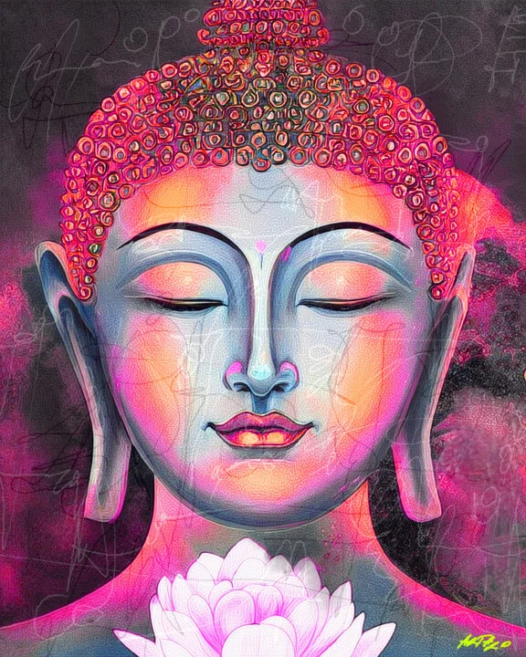 Capturing a serene Buddha face, this 38 x 48.3 cm digital artwork is adorned with intricate pink hues against a deep black background. I blended soft gradients from rose to fuchsia, and there’s a slight texture bump where I layered the curls. The interplay of light creates depth around the figure, while a delicate white and pink lotus adds a serene touch. This piece is print-ready for various mediums. This meditative process reflected on peace and mindfulness during my creation. The warm pinks evoke a gentle, uplifting atmosphere. Visualize this 38 x 48.3 cm artwork printed on metal, adding a unique touch to your meditation space. It’s for those who appreciate calming beauty in their environment. Whenever you’re ready, I’d love for you to make it a part of your journey.