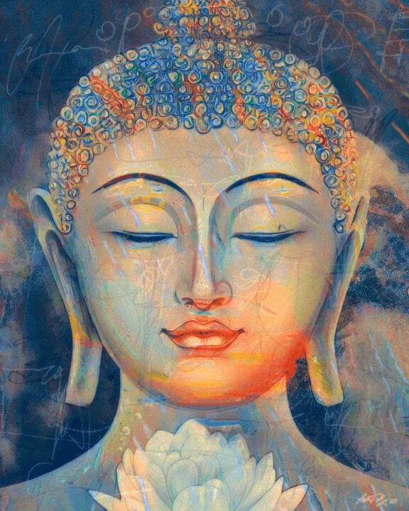In this vibrant digital print, a serene Buddha is enveloped in gentle blues and soft oranges, balanced against intricate background patterns. This 38.1 x 48.3 cm piece reflects advanced digital painting techniques with layers that create depth. A small smudge on the edge adds a unique character to the artwork. Light interacts beautifully with the colors, enhancing the tranquil feeling of the composition. A digital file ready for various print mediums, capturing the essence of calm. Inspired by my travels throughout Asia, I wanted to encapsulate a sense of peace. This 38.1 x 48.3 cm piece would make a stunning display in your reading nook, perfect for anyone seeking a calming atmosphere. You can choose the medium that best fits your decor. I'm here to help whenever you’re ready.