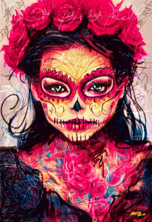 This digital artwork presents a beautifully decorated woman with a vibrant pink floral crown. Her striking green eyes contrast against intricate sugar skull makeup, blending pink, yellow, and black hues. I used layering techniques to bring depth to the background, which flows softly to complement the main subject. You might notice a light brush stroke on the left where I added texture. The way light catches this piece creates a rich visual experience. It’s a high-resolution digital file, perfect for bringing to life in any medium. Inspired by the Day of the Dead traditions, this piece fuses joy and remembrance. This 38 x 56 cm artwork would make a unique statement above your dining table, ideal for those who cherish cultural art. I'm excited for you to enjoy it as much as I did creating it!