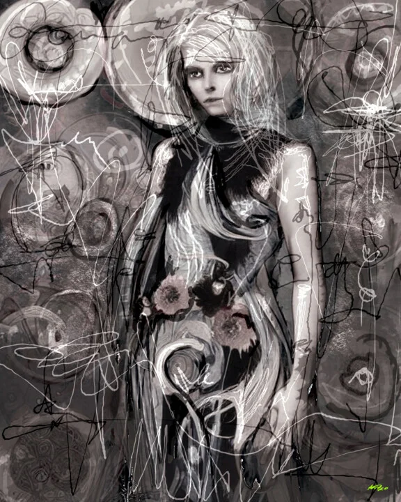 In this striking 76.2 x 93.98 cm artwork, soft black and white shades contrast with hints of peach around the figure of a blonde diva. The floral elements add life to the intricate background of swirling lines. The digital layering techniques create depth, but there's a little warp at the bottom that adds a unique touch. Light plays off the surface to highlight the intricate details, making it captivating. This is a ready-to-print high-resolution digital file. Inspired by the beauty of femininity, I aimed to capture an ethereal essence. The contrast of monochrome and subtle hues evokes mystery. Print this 76.2 x 93.98 cm artwork on an acrylic panel for a stunning focal point in your entryway. You choose the size and medium that suit your style. I'm excited to see how this piece enhances your space.