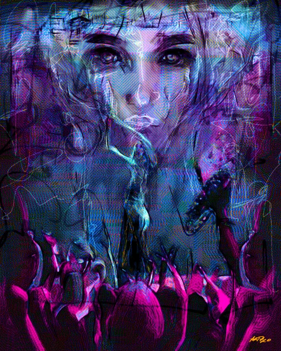 This 51 x 63.5 cm digital portrait showcases a dynamic blend of cerulean and magenta hues, highlighting a diva’s essence. I employed intricate layer compositing to add depth around the figure while contrasting expressive eyes with a chaotic background. There's a subtle pencil mark at the corner, a handmade detail adding authenticity. Light plays across the surface, enhancing the vibrant colors. This high-resolution file is perfect for printing in various formats. Creating this piece was a journey through my fascination with feminine energy. It evokes both strength and vulnerability. Print this 51 x 63.5 cm artwork on metal for a stunning focal point in your entryway. Choose the size and medium that work best for your space. I'm here to enhance your environment with this artwork.