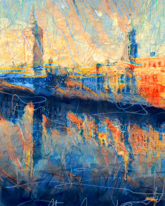 In this high-resolution digital artwork, vibrant oranges and deep blues depict Dublin’s Custom House area. The composition blends layers of color with luminous effects, creating a dreamlike reflection on the water. There's a noticeable brushstroke that gives a sense of motion. Light plays across the surface, inviting the viewer in. Suitable for a variety of print mediums, this file is ready for your choice. While wandering through Dublin's historic areas, I felt the fleeting beauty of the city. The warm hues evoke cozy feelings. Print this 38.1 x 48.3 cm work on fine art paper for your hallway. Ideal for those who appreciate captivating focal points. I’m here whenever you want to make it part of your home.