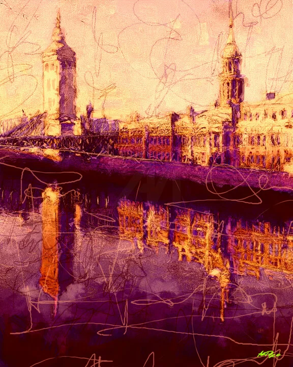 This digital artwork features a blend of vibrant yellows and deep purples, capturing Dublin's Custom House area in a 38.1 x 48.3 cm format. I layered colors digitally, creating a painterly effect that reflects the silhouette of the buildings onto the shimmering water. There's a small glitch in the swirling lines that adds a unique charm. The rich textures catch light in intriguing ways, enhancing the overall depth. Hand-crafted digital piece that looks stunning when printed. Wandering through the city inspired this piece, evoking a nostalgic warmth. This 38.1 x 48.3 cm artwork would be a striking focal point in your dining area. It’s ideal for anyone who appreciates the vibrancy of city life. Here if you need it.