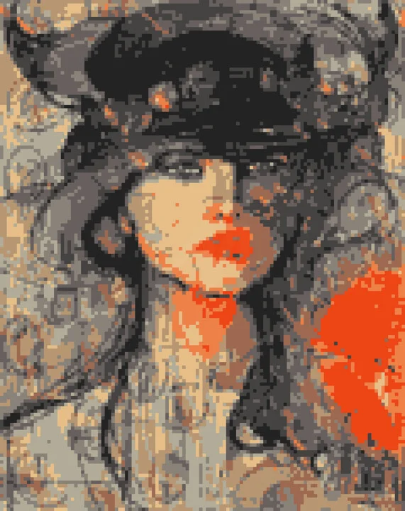 This digital piece captures a woman set against a rust and ochre background, showcasing a 50.8 x 63.5 cm canvas feel. The mosaic-like pixel art creates a warm, haunting atmosphere. I used layer compositing techniques to blend the figure smoothly with the background, though there's a small smudge in the rust area where I brushed too hard. Light dances on the surface, adding dimension and intrigue. This high-resolution digital file is perfect for printing. Inspired by the lively colors of a local market, this piece evokes warmth and curiosity. It would look striking as a 50.8 x 63.5 cm print on fine art paper right above your bed, adding a touch of personality to your space. Ideal for anyone who appreciates art that tells a story. Let’s transform your wall with this captivating piece!