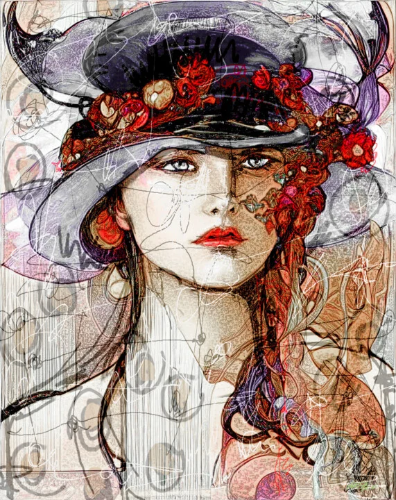 This high-resolution digital artwork features a woman with a floral hat against muted greys and soft natural tones, set on a 50.8 x 63.5 cm canvas. The intricate layering creates visual depth, and there's a little inconsistency in the background texture from my layering technique. The light textures combined with subtle patterns bring out the woman's expressive features beautifully. An ideal file for various print formats. Inspired by vintage elegance, I sought to capture timeless beauty in this piece. The soothing grey tones evoke a serene nostalgia. This 50.8 x 63.5 cm artwork would make a stunning accent in your hallway, perfect for anyone who cherishes grace in art. I’d be happy to help you find the perfect spot for it!