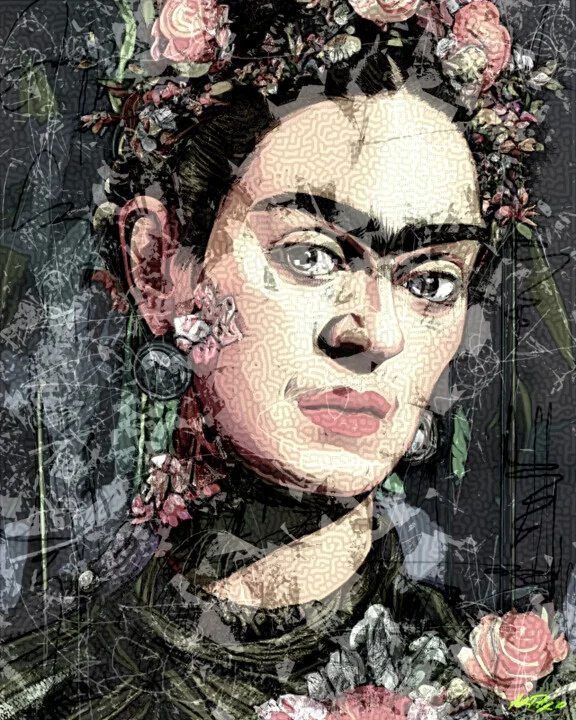 This digital artwork presents Frida Kahlo in detailed ochre and rose hues, blending intricate floral elements and textured backgrounds. I utilized digital painting techniques to enhance her features, creating a mosaic-like effect that adds depth. A small brush stroke mistake gives it a unique charm. Light interacts gently with the surface, bringing the layers to life. Printable up to 38 x 48.3 cm, this hand-painted original captures the vibrancy of her spirit. Inspired by Frida's connection to nature, I wanted to evoke resilience and beauty in this piece. This 38 x 48.3 cm artwork would shine on an acrylic panel, making a stunning impact in your bedroom. It’s for those who appreciate art that resonates. I hope you find it a true treasure.