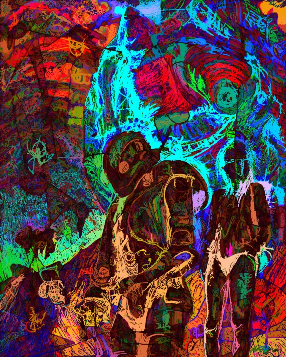 In this 40.6 x 50.8 cm digital art, electric blue intertwines with fiery orange, depicting an astronaut's encounter with abstract alien figures. I used dynamic brush techniques to create swirling movement throughout the scene. There's a minor glitch in the texture that adds to the piece's unique charm. Light interacts with the vibrant colors, enhancing the sense of energy and wonder. Original digital artwork, ready to vibrantly transform your space. Inspired by my love for space exploration, I aimed to capture an imaginative encounter with alien friends. This 40.6 x 50.8 cm artwork would look fantastic in your study, adding a touch of whimsy. Perfect for dreamers and adventurers alike. Ready when you are.
