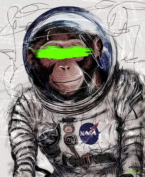 A vibrant surreal portrait, this 40.6 x 50.8 cm digital artwork showcases a monkey in an astronaut suit. The green eyes stand out against tan and gray blends, with a slight imperfection in the background that adds depth. Dynamic movement surrounds the figure, enhanced by the electrifying light effects. Perfect for fine art paper or canvas prints, capturing every intriguing detail. Inspired by the important roles primates have played in space exploration, I wanted to evoke curiosity. This piece would be a striking addition to your home office, bringing whimsy and charm. Choose your preferred medium and size effortlessly. Immerse yourself in this original digital creation by ArtH2O.