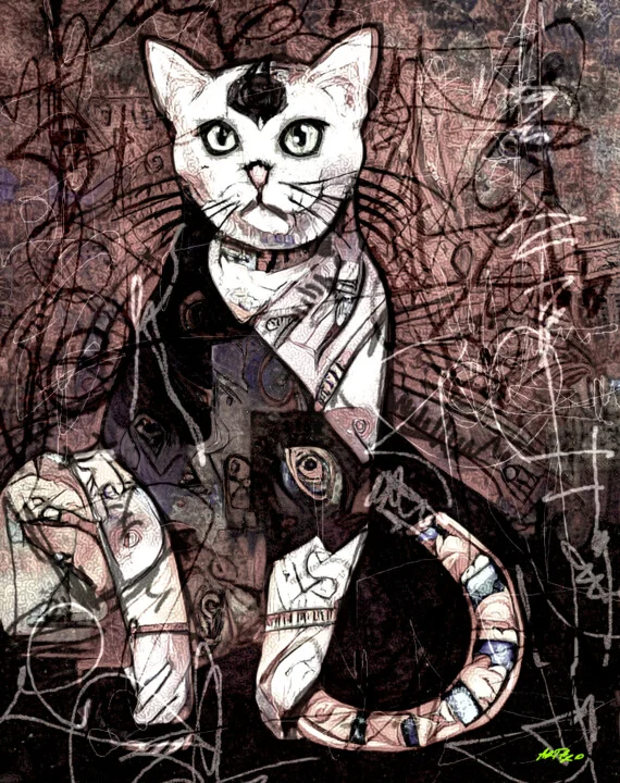 This digital artwork features a striking white cat set against an abstract background filled with intricate lines and shapes. The cat’s vivid green eyes lend an almost lifelike quality, while digital effects add to the sense of depth. A small flaw exists where the background colors merge, giving it a handcrafted feel. The contrast between dark shadows and lighter tones enhances its elegance and mystery. This is a stunning original digital piece you’ll want to see in person. During a late-night sketching session, I drew inspiration from my own cat's majestic pose. This piece captures a blend of whimsy and sophistication. This 50.8 x 63.5 cm artwork would be a fantastic addition above your modern living room couch. It’s for anyone who appreciates the beauty of animals captured in art. Excited for it to become part of your collection!
