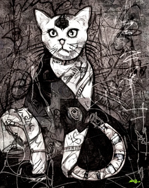 Rendered in striking black and white, this digital piece depicts a stylized cat framed by intricate line work and overlapping textures. The depth is magnified by the chaotic background that draws you in. There’s a slight mark on the corner where I adjusted the contrast, adding character. The interplay of light and dark creates a compelling visual experience. This is a hand-painted digital original that truly captures an urban aesthetic. Inspired by my quirky cat, I aimed to fuse realism with abstraction. This artwork radiates playfulness and intrigue. Print this 51 x 64.5 cm piece on fine art paper to highlight its details in your living room. Perfect for those who appreciate contemporary art with personality. Can't wait for you to enjoy it!