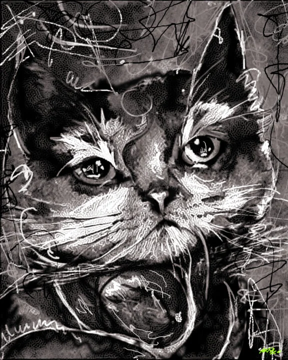 Original title: Gloomy Cat Black and White Digital Art