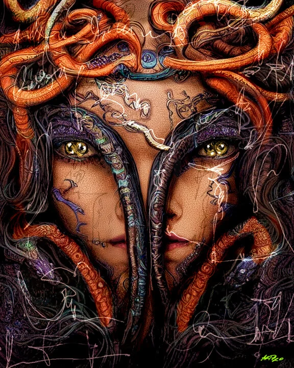 In this high-resolution digital piece, vibrant oranges and deep purples blend to form a mesmerizing Medusa figure. I utilized dynamic layering techniques to create rich textures that contrast with her golden eyes, drawing you into her captivating presence. There's a slight imperfection where the color didn’t blend as smoothly, adding character to the artwork. Light catches the colors beautifully, enhancing the piece’s depth. A unique, hand-crafted digital work that you'll want to see in person. This piece reflects my passion for mythology and the emotions it stirs. It would make a striking focal point above your sofa with its 50.8 x 63.5 cm size. Suitable for anyone who appreciates the intricate dance of color and narrative. I’m here when you’re ready to embrace it.