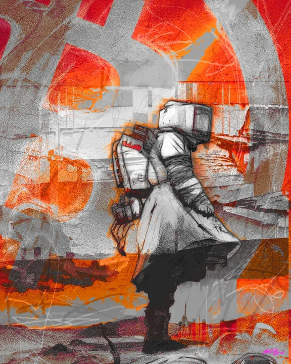 This striking digital piece features a lone figure in a futuristic suit against a rich backdrop of vibrant orange and gray. I used a layering technique to create dynamic shapes and enhance the atmosphere of space travel. You might notice a rough edge where my brush slipped, adding a bit of character. The bold colors create a strong contrast that plays with light, evoking a sense of urgency. It's a hand-crafted digital work that you'll appreciate in person. Reflecting my love for space travel, this 50.8 x 63.5 cm artwork conveys adventure and solitude. It would look amazing as a metal print in your home office. Ideal for anyone who enjoys exploring the unknown through art. Here to help when you're ready.