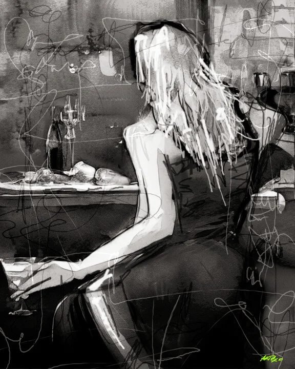 This 51 x 63.5 cm digital piece captures the elegant silhouette of a woman seated at a bar, created with striking black and white contrasts. Layered textures and flowing lines bring a dynamic energy to the composition. There's a faint area where the ink bled slightly, adding to its handmade charm. The interplay of light and shadow creates a contemplative mood, inviting viewers to immerse themselves in the moment. This hand-painted original showcases an artistry that feels alive. I drew inspiration from cozy evenings spent in bars, wanting to encapsulate that essence of introspection. This piece would be a stunning focal point in your living room, ideal for anyone who cherishes unique art. I'm excited for you to enjoy it!