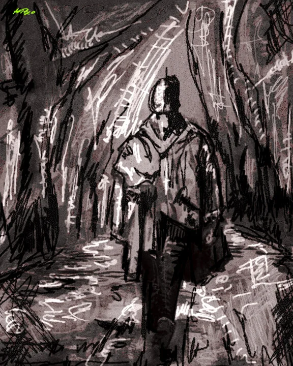 This 51 x 63.5 cm digital artwork portrays a solitary figure walking a dimly lit path in deep shades of black and gray. I've layered textured brushwork with swirling lines, evoking the mystery of a forest. A slight smudge near the pilgrim's cloak serves as a reminder of my creative journey. The dramatic contrast of light and shadow enhances the emotion of solitude, making this hand-painted original a piece you'll want to see in person. Inspired by my reflections on a solo hike, this piece evokes deep introspection. It would make a captivating addition to your reading nook, perfect for anyone who appreciates art that tells a story. I can't wait for it to be part of your space!