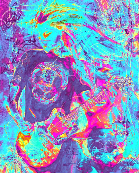 This high-energy 51 x 64.5 cm digital artwork features a guitarist surrounded by vibrant neon blue and pink hues. The dynamic lines and layered textures create a sense of movement that captures the essence of live music. There's a slight ripple in the background where paint blended unexpectedly, giving it a unique character. The light plays off the colors, adding depth and excitement to the scene. This hand-painted original boasts a quality you need to see to believe. This vibrant piece brings back memories of electrifying nights at music festivals. It would shine as a statement piece in your music studio, ideal for those who live for rhythm and color. I look forward to you adding this dynamic work to your collection!