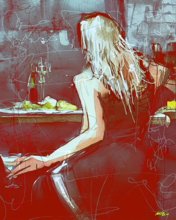 In this striking 51 x 64.8 cm digital artwork, a woman seated at a bar is enveloped in rich crimson hues. The bold colors contrast beautifully with her light hair, achieved through careful layering techniques. An edge of the glass where I painted has a slight lift, adding to its handmade charm. The swirling freeform lines evoke a sense of movement, drawing you deeper into the scene. This hand-painted original is a unique representation that brings warmth to any space. Inspired by cozy bar nights, I wanted to convey a blend of vibrancy and intimacy. This piece would make a beautiful display above your dining table, perfect for anyone who enjoys art that invites conversation. I'm here when you're ready to make it yours!