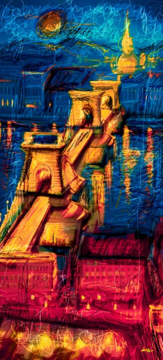 Vivid oranges and pinks illuminate this 51 x 112 cm portrayal of Budapest’s bridges at dusk. Layered brushwork creates depth, with energetic strokes suggesting movement across the water. There's a soft edge where I merged colors that adds uniqueness to the piece. The warm glow contrasts beautifully with deep indigo skies, drawing the viewer in. This original digital artwork is ready for a striking print. Inspired by a night along the Danube, I aimed to capture the city’s vibrant energy. The colors resonate warmth and passion. Print this 51 x 112 cm artwork on acrylic for a stunning display in your living room. Perfect for those who appreciate dynamic art. Let me know if you need any assistance!
