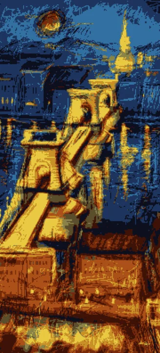 This 51 x 112 cm digital artwork is awash with deep blues and shimmering golds, showcasing a mesmerizing view of Budapest at night. The Chain Bridge sparkles with pixelated texture, while layers of color blend effortlessly, bringing the scene to life. There's a small lift at one edge from where I adjusted the brush too late. The reflections on the water catch light beautifully, creating a magical atmosphere. This print-ready digital file is perfect for your wall. Inspired by midnight walks along the Danube, this piece captures the enchanting essence of Budapest. The contrasting tones evoke nostalgia and wonder. Print this 51 x 112 cm artwork on canvas for a standout piece above your dining area. Ideal for anyone who appreciates art that tells a story. Ready to brighten your space?