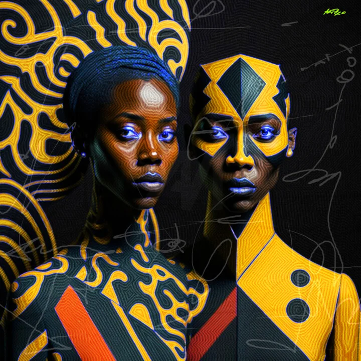 This striking digital artwork measures 63.5 x 63.5 cm, featuring two figures adorned in vibrant yellow and blue patterns. The swirling lines of the background create an intricate setting that highlights their symmetry and contrasts. I added depth through digital effects, allowing the figures’ expressions to stand out. An intentional brush mark near the edge shows the hand of the artist. Hand-painted original, rich in texture and color. Inspired by traditional African styles, this piece reflects powerful cultural themes blended with modern artistry. Its serene yet vibrant mood is perfect for a captivating bedroom focal point. Choose your preferred medium and size for this unique artwork. Embrace the beauty of digital art today!