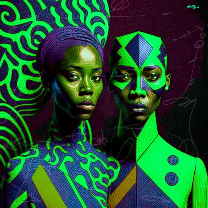 This dynamic digital artwork vibrates with neon green and deep purple, creating a captivating contrast. The figures are enveloped in stylish line art that enhances their connection. I used a flat brush technique for the sharpness of the shapes, and there's a slight lift on one edge where the digital canvas wasn’t secured. Light interacts with the layers, giving depth and movement across the piece. A hand-crafted digital creation that deserves your attention in person. Inspired by the beauty of African patterns, I aimed to capture unity and strength. This 63.5 x 63.5 cm piece would make a fascinating focal point in your dining room. Ideal for those who appreciate bold, cultural aesthetics. Here when you’re ready.