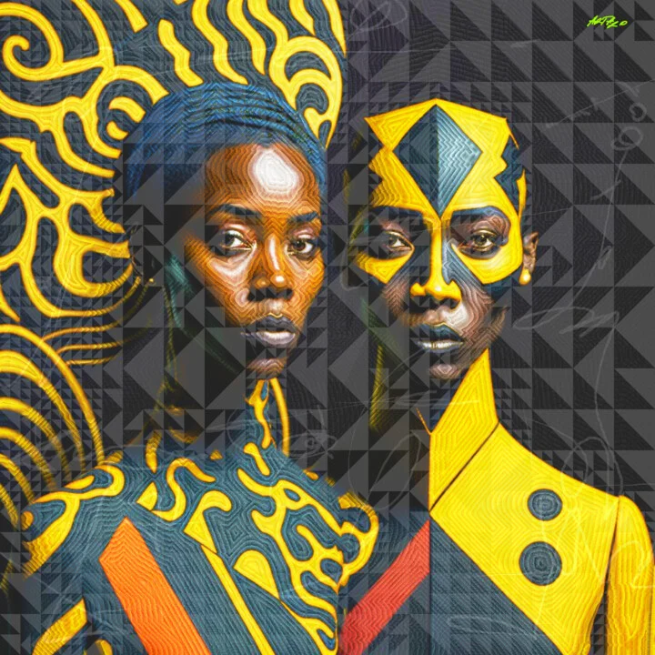 This 63.5 x 63.5 cm digital artwork features bold gray and yellow tones, with two figures prominently highlighted. The intricate geometric patterns behind them provide depth and dimension. I utilized a digital brush technique that showcases detailed linework, and there's a subtle scratch on one corner where the canvas wasn't entirely smooth. The interplay of light adds a unique texture that enhances the visuals. A hand-crafted digital piece waiting for your gaze. Inspired by vibrant cultures, I wanted to convey connection and strength. This piece would stand out beautifully in your office gallery. Ideal for anyone who values art that tells a story. Here if you need more details.