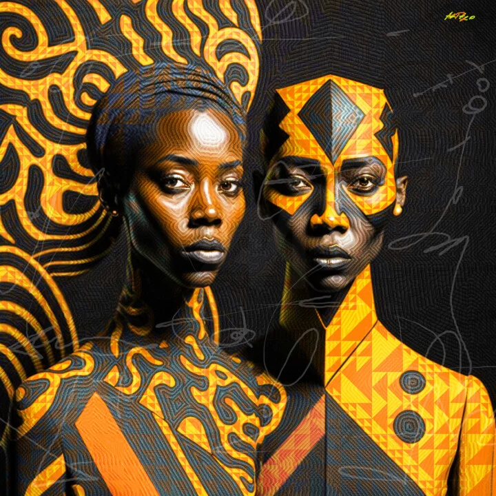 This vibrant digital artwork blends ochre and ebony tones, depicting figures with bold geometric designs. The intricate triangular motifs weave around them, creating a captivating visual narrative. Layer compositing techniques enhance textures, and there's a slight inconsistency in the line work that adds character. Light dances on the surface, making the colors pop against the dark background. It's a hand-rendered digital creation that genuinely stands out. My inspiration came from traditional African prints, reimagined through digital art. This 63.5 x 63.5 cm piece would create an impressive statement in your entryway. Perfect for those who appreciate cultural storytelling in art. I'm here whenever you're ready.