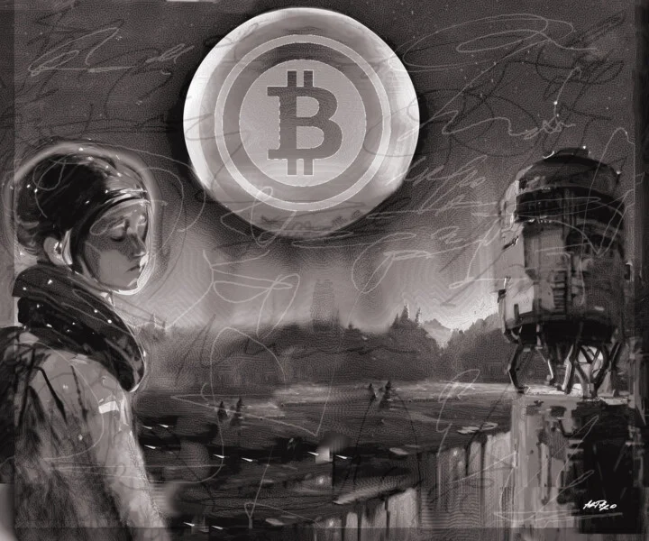 In this 76.2 x 63.5 cm digital composition, a girl in a space suit gazes at a Bitcoin symbol lit against a stark black moon. I blended deep blacks with subtle grays, adding highlights to create depth. You can spot a small smudge on the left edge where I brushed too close with my digital stylus. The textures subtly shift as light interacts with the screen, enhancing the ethereal feel. This is a print-ready high-resolution piece, perfect for showcasing on various surfaces. Creating this piece sparked my fascination with cryptocurrency and space exploration. It blends wonder and technology beautifully. This 76.2 x 63.5 cm artwork would make a fantastic focal point in your home office above the desk. Perfect for anyone looking to bring a touch of futuristic art into their space. I’m here when you’re ready!