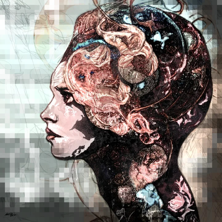 In this 76.2 x 76.2 cm high-resolution digital piece, I depict a girl's profile with intricate details in warm peach and deep black hues. The background swirls with chaotic brush strokes, creating a dynamic feel. You’ll notice a slight pixel error on her cheek, adding character to the artwork. The interplay of light enhances the textures, making it come alive. This is a print-ready file for various surfaces. While creating this, I explored the fusion of human forms and abstract ideas. It evokes a beautiful sense of introspection. This 76.2 x 76.2 cm piece would look fantastic on fine art paper in your home office. Perfect for anyone who loves unique and introspective art. Ready when you are!