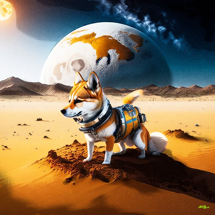 In this eye-catching digital artwork, an orange Shiba Inu stands confidently in an otherworldly landscape. The vibrant oranges and yellows flow seamlessly, capturing the playful spirit of the subject. I added depth using layer compositing, and there's a small smudge near the bottom where I tested the colors. Light reflects off the background, adding a whimsical touch. This is a high-resolution digital file, ready for printing. While creating this, I imagined dogs exploring space, which sparked my creativity. This 76.2 x 76.2 cm piece would be a playful centerpiece in your home office. Perfect for those who love whimsy and adventure in their decor. Enjoy it in your space!
