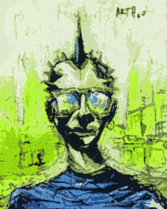 A bold punk character stands out against a backdrop of vibrant lime green and deep black hues in this 50.8 x 63.5 cm digital artwork. The layering techniques enhance the texture, and there's a slight pixelation where the mohawk meets the background. The oversized sunglasses reflect city lights, and the vibrant colors catch light in a playful way. This high-resolution digital file allows for stunning prints that showcase intricate details. This character reflects the lively punk scene I wanted to encapsulate. The energy feels alive and rebellious, ideal for a creative space. Print this 50.8 x 63.5 cm artwork on acrylic for a dynamic addition to your decor. I invite you to bring this piece into your home.