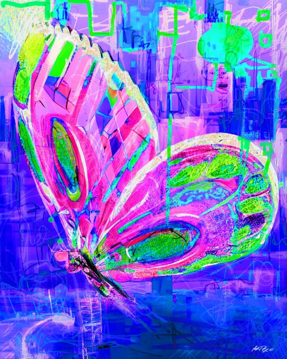 A lively mix of neon pink and electric green dominates this 50.8 x 63.5 cm digital canvas, showcasing a butterfly that emerges against a vivid purple backdrop. Textured digital brushstrokes create depth, while smooth gradients enhance the butterfly's form. There's a small pixel disruption in the lower corner from my layering technique. The way light interacts with the colors adds a fresh vibrancy to the piece. A unique hand-painted digital artwork ready for printing. While experimenting with colors inspired by nature, I aimed to convey joy and energy in this piece. This 50.8 x 63.5 cm artwork would serve as a striking centerpiece in your office or creative space. It's for those who appreciate bold and energetic art. Whenever suits you, I'm here to help!