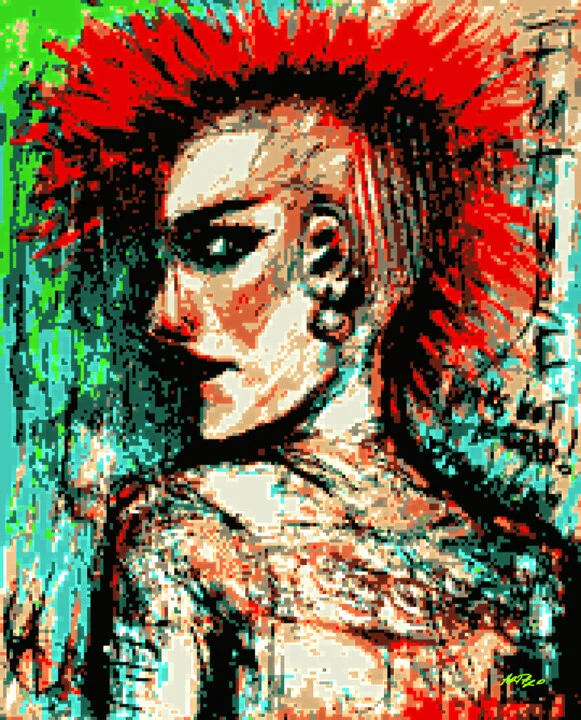 In this high-resolution digital artwork, vibrant reds and blacks swirl around a punk girl with striking spiky hair, measuring 51 x 63.5 cm. I used pixel art techniques to enhance her edgy vibe, while the textured background merges chaotic greens with hints of blue. There’s a slight color bleed near the bottom edge from my layering process. The interplay of light emphasizes the bold colors, creating a striking visual impact. An original digital piece ready to make a statement. I sought to capture the raw energy of punk culture in this piece, evoking rebellion and individuality. This 51 x 63.5 cm artwork would make a bold statement in your modern living room. It appeals to those who embrace unique and expressive art. Feel free to reach out when you're ready to decide on a print medium!