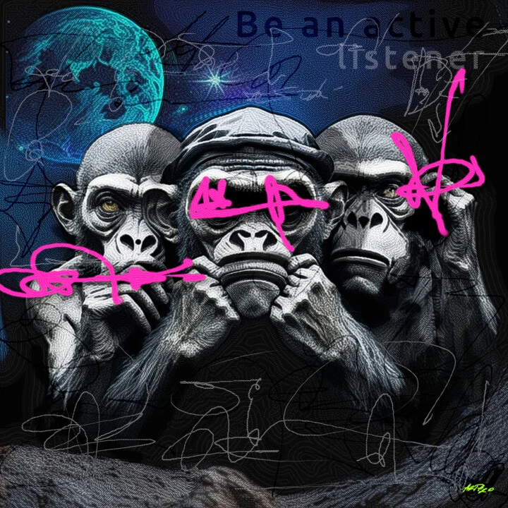 This vivid digital artwork transports you to a surreal world with three wise monkeys set against a celestial backdrop. The deep charcoal contrasts with electric pink highlights, creating a focal point. I utilized layering techniques to add depth, and there's a small texture bump where the color transitions, enhancing the vibrancy. The way light interacts with the elements brings the piece to life. This high-resolution file is great for prints in various media. Inspired by mindfulness, this piece reflects my thoughts on listening and understanding. Its vibrant essence would add a playful yet enigmatic touch to your modern apartment. This 63.5 x 63.5 cm artwork is perfect for anyone who loves unique expressions of art. Let’s chat about bringing it to your space!