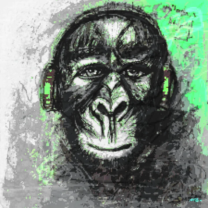 A stylized monkey's face bursts into view, adorned in layers of black and vibrant green in this 63.5 x 63.5 cm digital artwork. The pixelated texture gives it a modern edge, and there's a tiny spot where the color didn’t quite set as I intended, adding a personal touch. The interplay of light creates depth and interest throughout, making it truly stand out. This original digital work is ready for various print mediums. This piece emerged from my passion for wildlife and music, embodying a playful spirit. It would be a fantastic accent in a contemporary office setting, drawing attention and sparking conversation. Perfect for anyone looking to energize their walls with unique art. I'm here if you have questions.