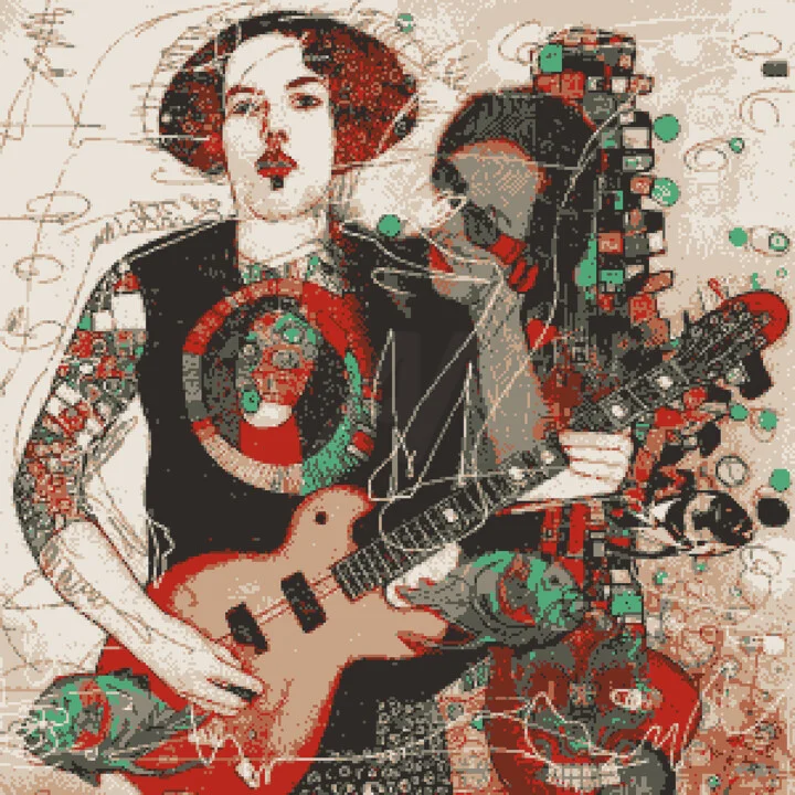 This 63.5 x 63.5 cm digital artwork bursts with vibrant crimson and teal hues, capturing the essence of a guitarist in motion. I layered intricate patterns to enhance the texture, and you'll spot a small imperfection in the background where colors blend. Light plays beautifully on the surface, creating shadows that give life to the overall composition. The playful chaos of this piece reflects the energy of a concert, designed to capture attention. Print-ready for your ideal medium. Inspired by a concert I attended, where every note felt electric. This artwork is for those who love music and want to express it visually. Perfect for your contemporary music room, this 63.5 x 63.5 cm piece is versatile in medium and size. Whenever you’re ready, I’d love for you to welcome this vibrant piece into your space.