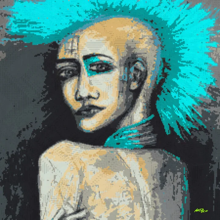 This 63.5 x 63.5 cm digital piece presents a punk girl with a striking turquoise mohawk, set against a backdrop of deep grays and off-whites. I played with pixel art to give her features a unique texture, and you can spot a tiny scratch near the top left corner where I adjusted the layering. Light dances across the surface, enhancing the depth of her expression. It's a high-resolution digital file, ready for printing on canvas or metal, capturing the punk spirit beautifully. Creating this portrait felt like channeling the vibrant punk culture that inspires me. It encapsulates individuality and defiance. A 63.5 x 63.5 cm print would look fantastic on the wall above your office desk, inviting conversation and energy into the space. This piece is perfect for anyone who cherishes uniqueness. Here if you need it.