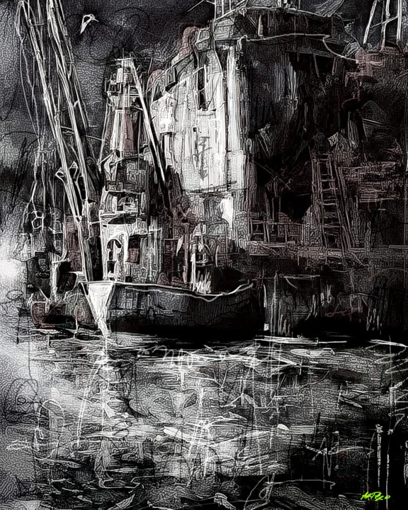 Original title: Black White Port Scene Digital Art